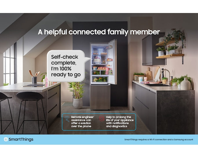 Stylishly finished in sleek Silver, the fridge freezer offers a modern aesthetic that complements any kitchen decor. The SmartThings AI Energy system integrates energy-saving technology with smart management to help minimise energy usage and optimize the appliance’s performance.